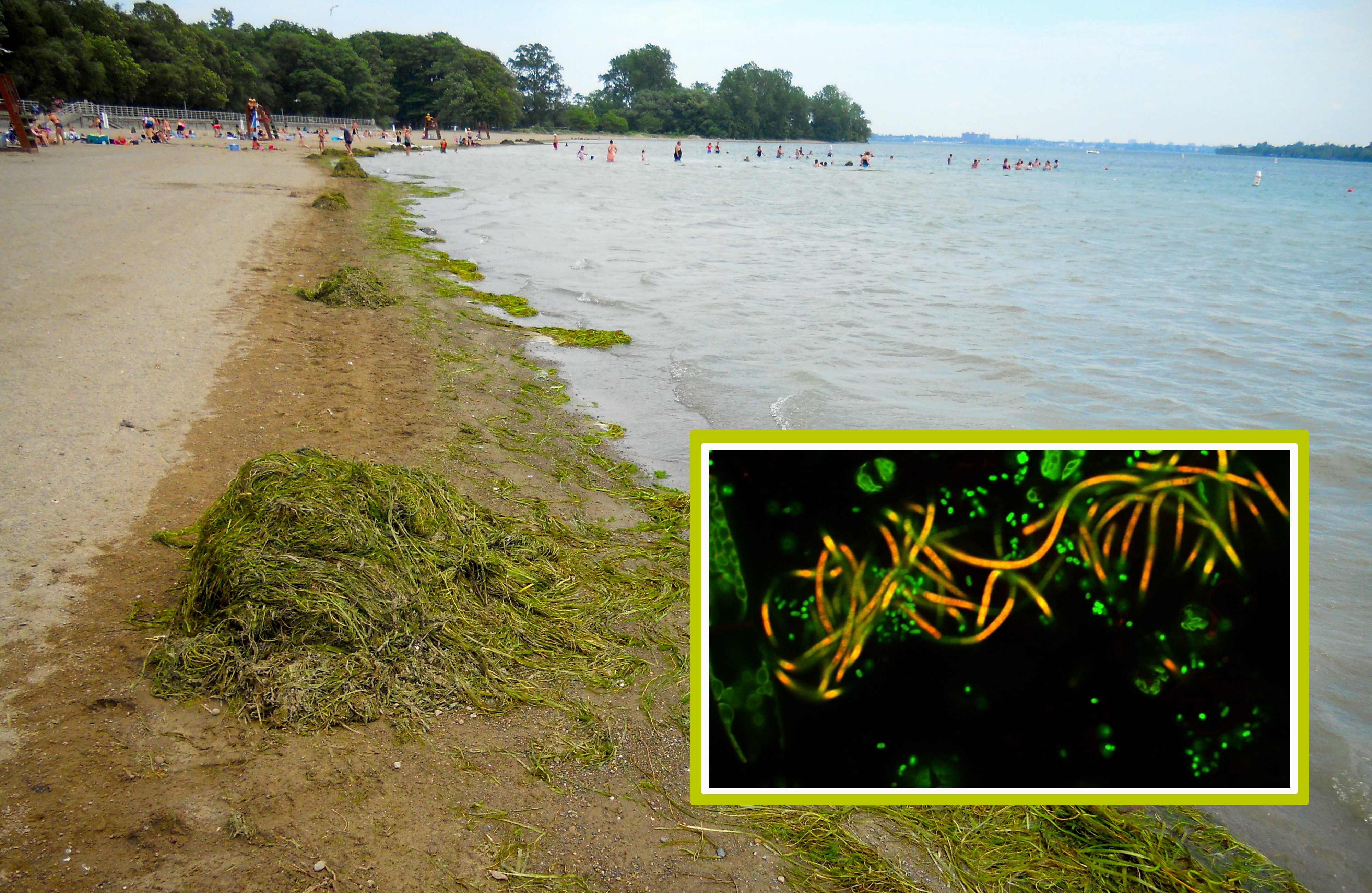 UB researchers found that green algae blooms (orange strands in the smaller picture) act as a barrier between UV radiation and bacteria, such as salmonella (green dots), which allows organisms to grow unheeded on Great Lakes beaches.